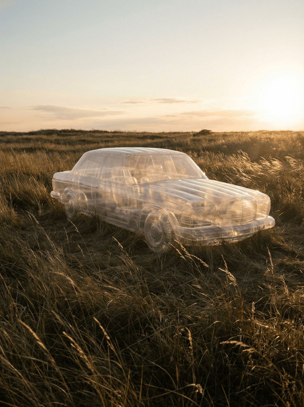A realistic photo of a full-size transparent inflatable car standing in the middle of a wild grassy field during golden hour, soft warm sunlight, long shadows, gentle breeze moving the grass, surreal and poetic atmosphere, high detail and natural colors.